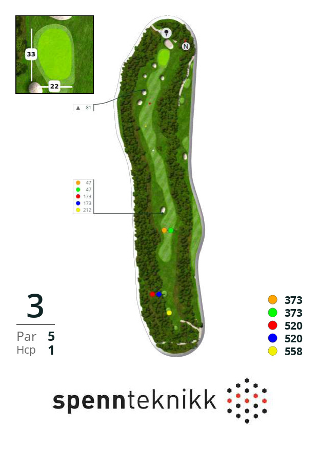 Hullets nedsenkede form svinger seg igjennom et vakkert furulandskap mot en green langt borte. Det handler om deg, naturen og golfopplevelsen, og du beveger deg gjennom flere av naturens rom når du beveger deg mot greenen. Med sine 591 meter fra hvit tee, er det et av landets lengste par 5 hull.