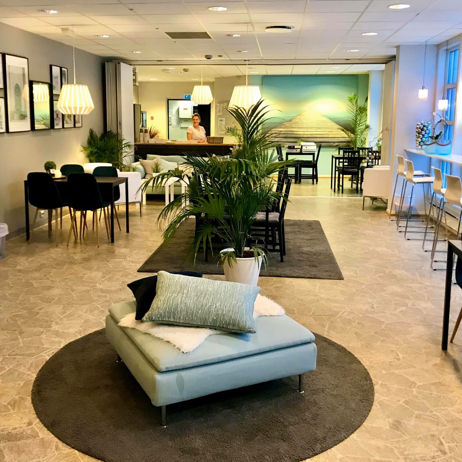Det er en lounge i 1. etasje på hotellet. Her er det gratis kaffe og te, engangstallerkener, bestikk og glass, mikro, og en tillitsbasert Vipps-kiosk med brus og sjokolade.